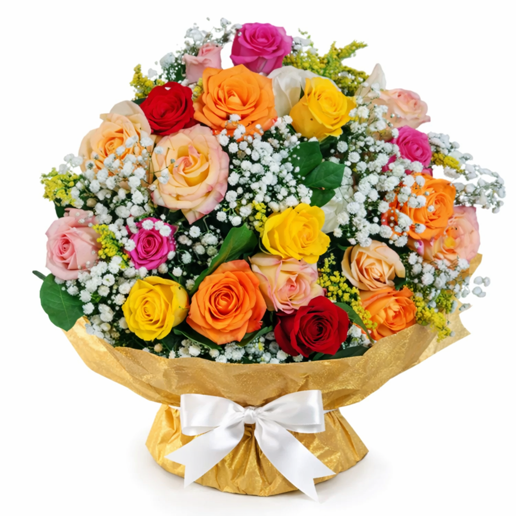 O arranjo é composto por rosas em diferentes tons, harmonizadas com delicadas flores complementares e folhagens verdes que valorizam ainda mais as cores naturais das flores. O buquê é finalizado com embalagem elegante e laço de cetim, garantindo um visual sofisticado e encantador.