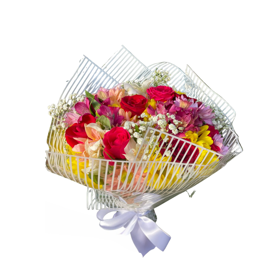 Composto por 6 rosas vermelhas intensas, astromélias coloridas e margaridas delicadas, este arranjo é perfeito para demonstrar amor, gratidão ou simplesmente alegrar o dia de alguém especial. Um presente cheio de emoção, ideal para aniversários, celebrações ou surpresas românticas.