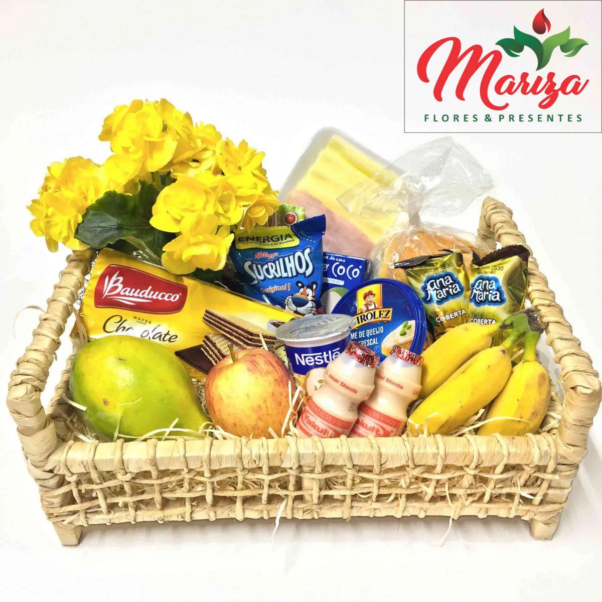 ITENS INCLUSOS: 1 ÁGUA DE COCO, BANANAS, BOLACHA WAFER BAUDUCO, 2 BOLINHOS RECHADOS, 1 IOGURTE NATURAL, 1 MAÇÃ, 1 MAMÃO, 1 FLOR DA ÉPOCA, 2 PÃES, BANDEJA DE FRIOS, REQUEIJÃO CREMOSO, 1 SUCO DE 200ML, 1 SUCRILHOS E 2 YAKULT.